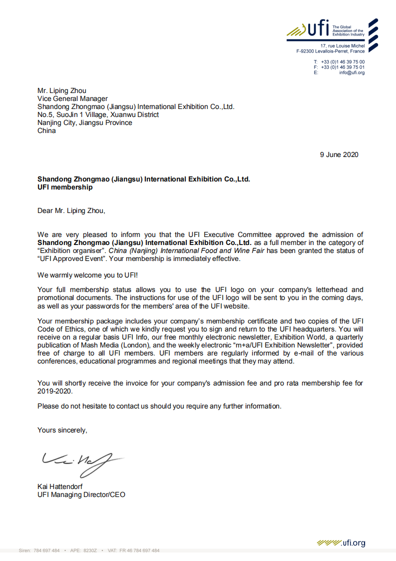 2020年6月9日,UFI(全球展覽業(yè)協(xié)會(huì))巴黎總部傳來喜訊:中法合資高博中貿(mào)會(huì)展在山東、江蘇、安徽主辦的CNFE全國食品博覽會(huì)(濟(jì)南)、CNWFF中國(南京)國際糖酒食品交易會(huì)、CAWFF中國(安徽)國際糖酒食品交易會(huì)三展同時(shí)通過UFI(全球展覽業(yè)協(xié)會(huì))認(rèn)證,同時(shí)高博中貿(mào)會(huì)展在山東、江蘇、安徽三個(gè)子公司也通過UFI評(píng)審委員會(huì)的表決,分別正式成為UFI(全球展覽業(yè)協(xié)會(huì))會(huì)員單位。通過UFI認(rèn)證,是國際會(huì)展行業(yè)對(duì)主、承辦單位組織辦展能力的肯定,對(duì)展會(huì)在國際化、專業(yè)化、品牌化運(yùn)營方面的充分認(rèn)可。借助UFI認(rèn)證展會(huì)的權(quán)威和影響,努力提升展會(huì)平臺(tái)新高度,助推會(huì)展經(jīng)濟(jì)的快速發(fā)展。