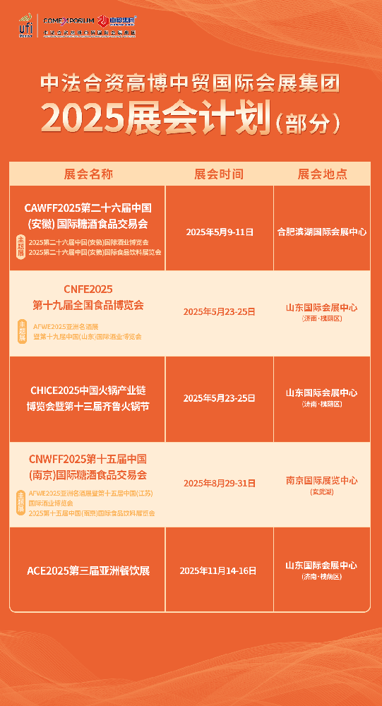 近日,中法合資高博中貿(mào)國(guó)際會(huì)展集團(tuán)經(jīng)過科學(xué)論證與研討,確定了旗下部分重要展會(huì)的舉辦檔期。其中,CAWFF2025第二十六屆中國(guó) (安徽)國(guó)際糖酒食品交易會(huì)將于2···